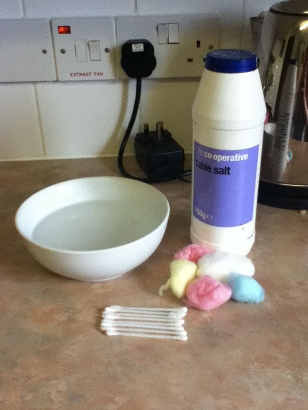 Using warm water, dissolve a good amount of salt into the water, about 2 tablespoons depending on how much water you use