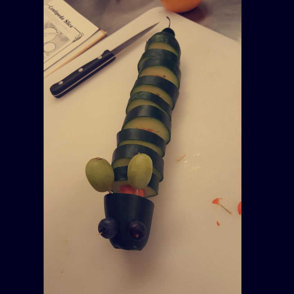 You will then take two grapes and two toothpicks and apply them at the second to last slice of cucumber and apply them for ears. And then will apply two blueberries for eyes at the end with toothpicks