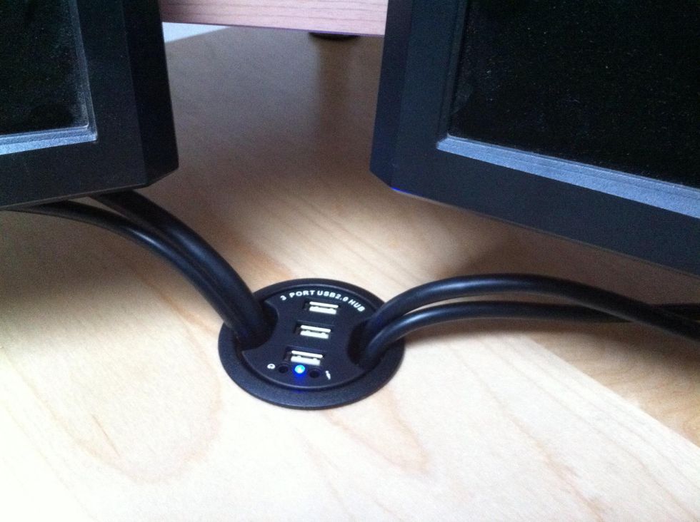 Get a cable hole from eBay. I got this one with a three-port USB hub, which is quite handy.