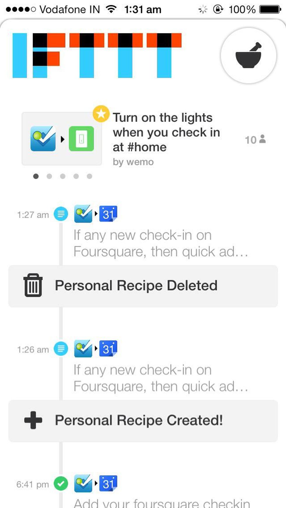 This is the home screen of the IFTTT app in my iPhone. To create your recipe, choose the pot pic in the top right corner of the page.