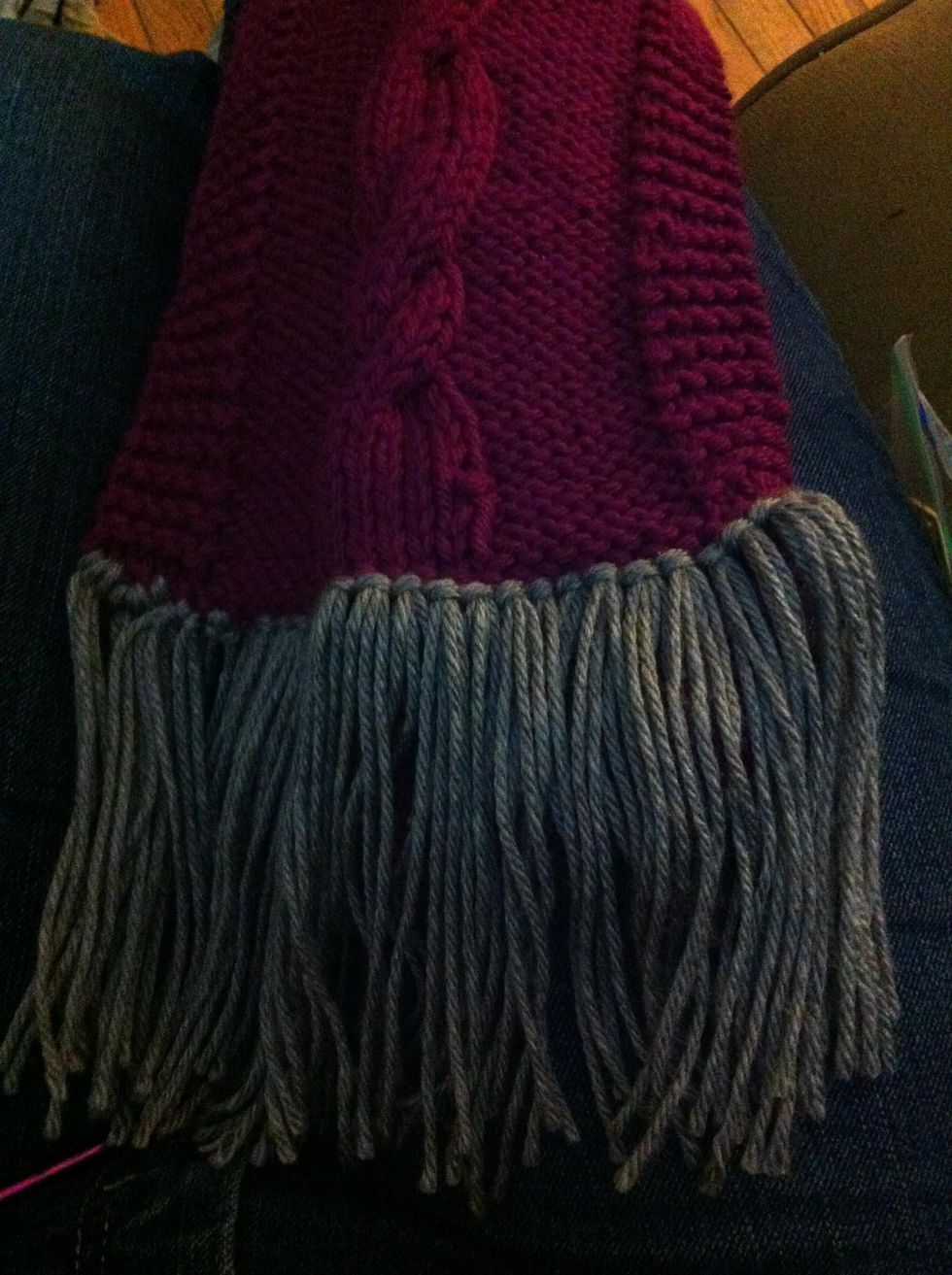 Repeat all steps until you have completed adding your fringe. This scarf is my Long & Short Cable Keyhole scarf that I will be adding to my blog hopefully this weekend!