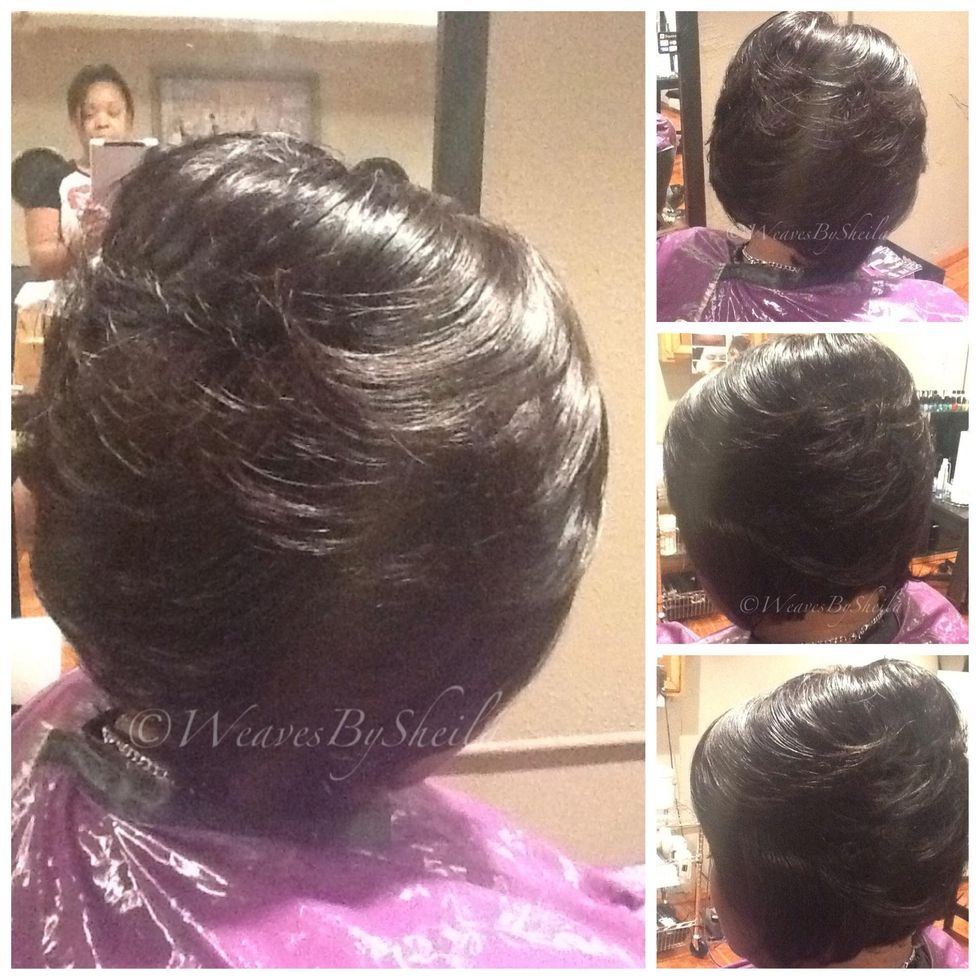 These may be a bit tricky, but all hair was pulled forward with a traveling guide as I stood in front of her to create this 80's feathered look on a sew-in weave.