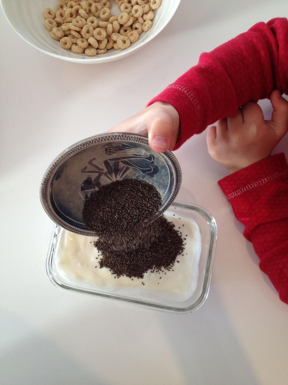 Mix 1/2 cup of the plain yogourt with 1/2 cup of the sweetened yogourt and stir. Pour some chia seeds either directly into the yogourt or let your little helper do it from a little bowl (more fun!)