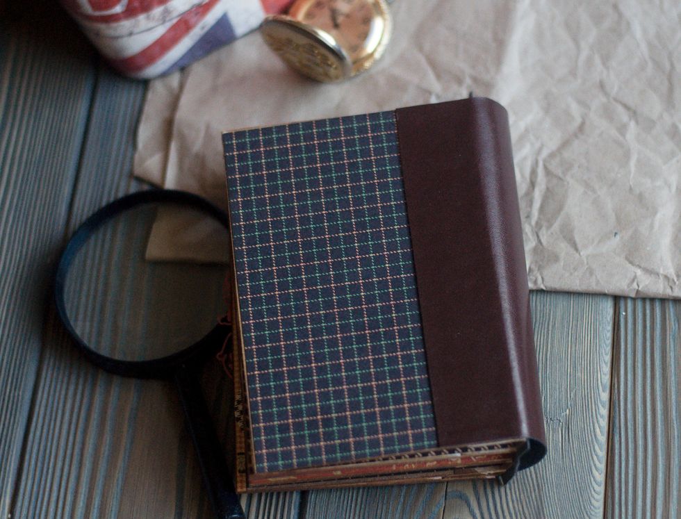 вырезала странички. Обратите внимание, бумага двусторонняя, одна сторона спокойная, вторая-с черепами, пауками.Ее я не использую.Беру стороны с клетками, лупой, геометрическими фигурками