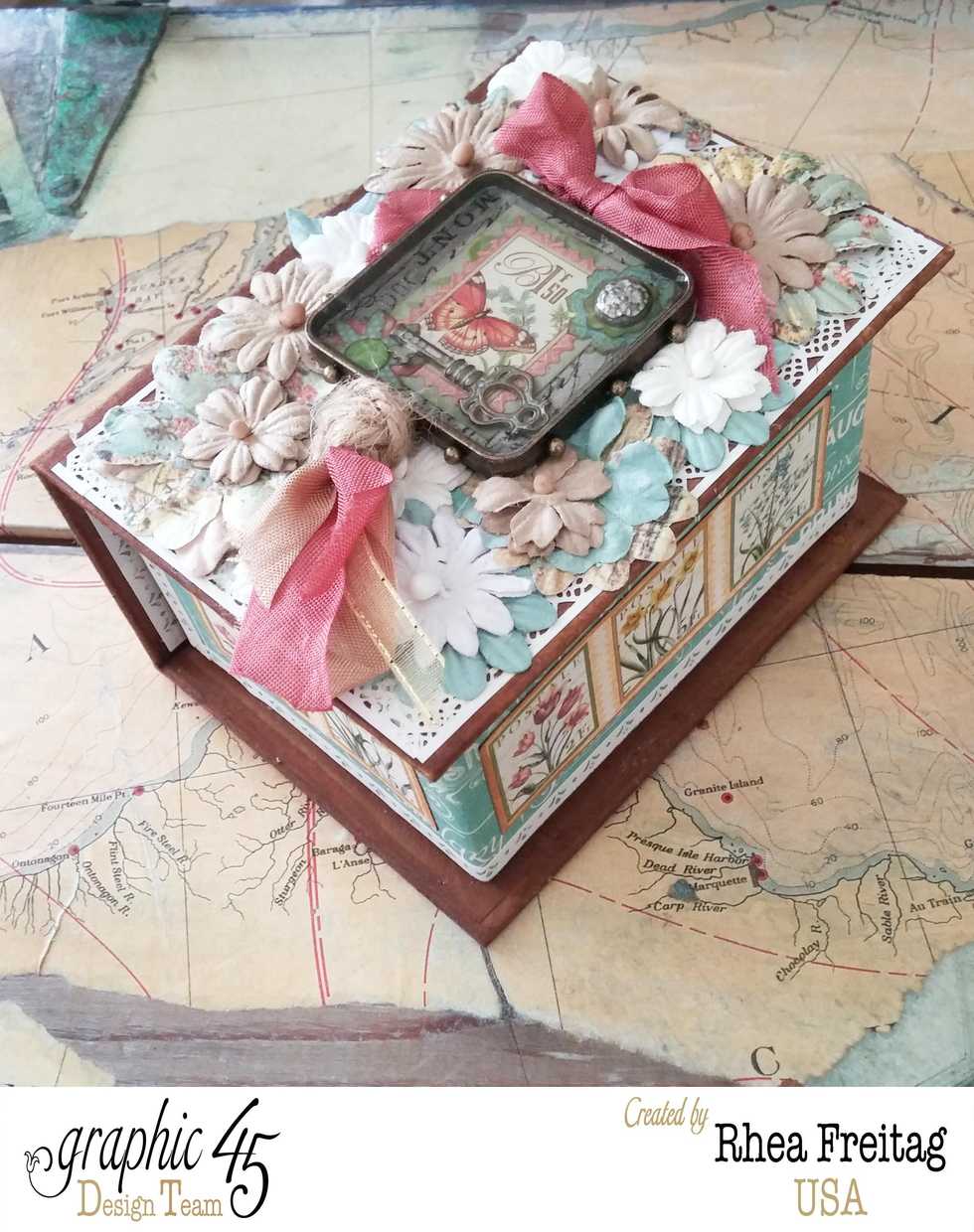An old bezel I had made in another tutorial for Graphic 45 was the perfect fit for a focal on my box. This was made with the lovely Botanical Tea stickers, Ice Resin and some Graphic 45 Staples.