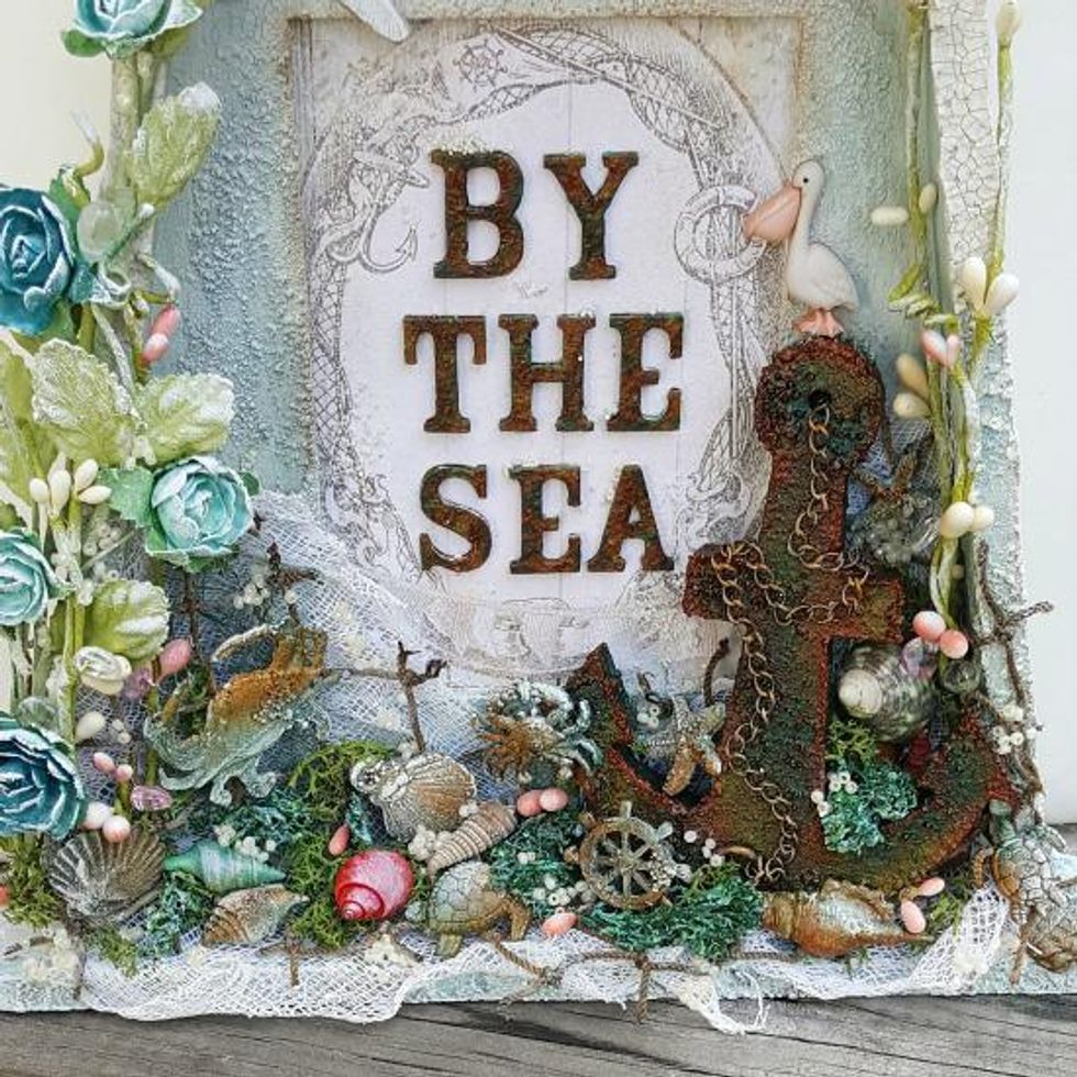 I cut the compass out from nautical themed paper and placed it behind the Melange pebble.