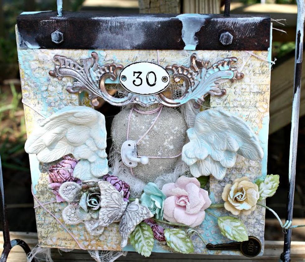 Once everything was dry I adhered the heart and wings to my canvas,,,then decorated with Prima's new metals!