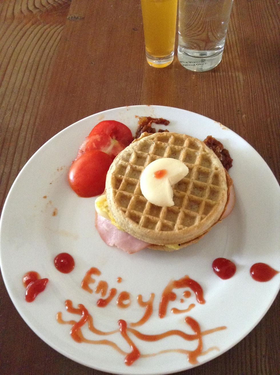 Then put eggs on the toaster waffle add the cheese on top the the ham and the tomato jam on top the put other toaster waffle on top and your done . Enjoy 😊