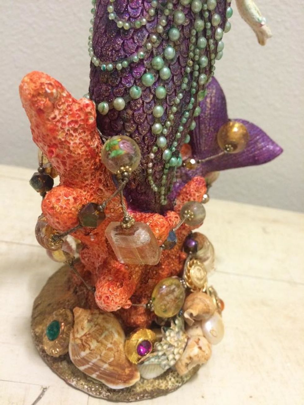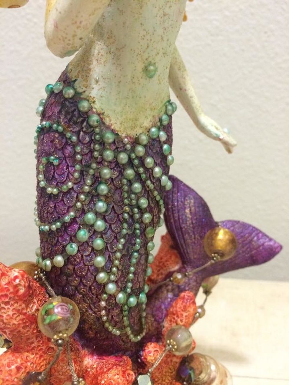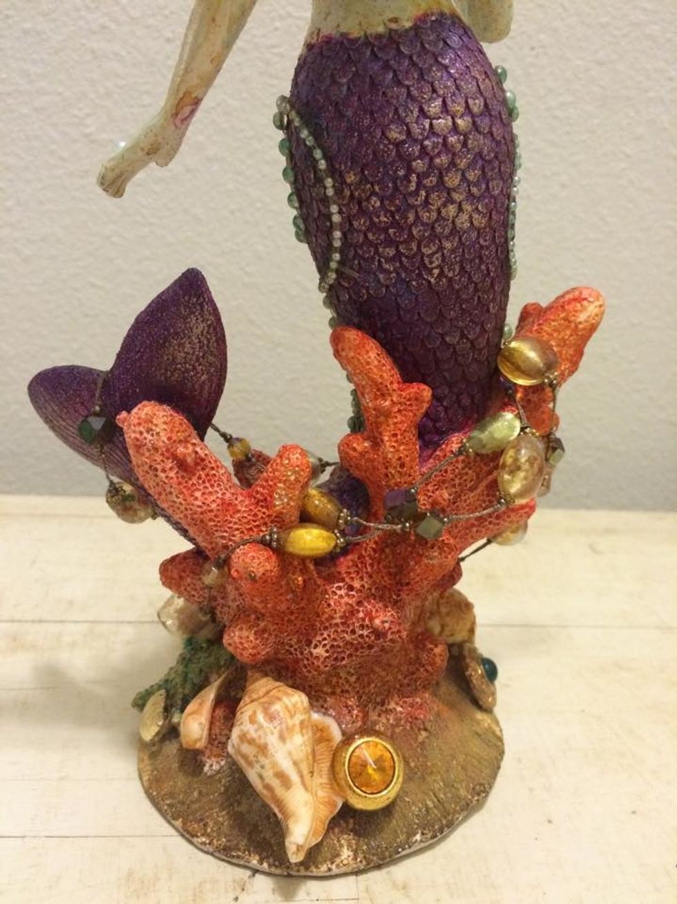Here she is completed. I draped an old necklace around the coral and her tail. She has all of her bobbles and bits she has collected. She is the Angel of the Sea.