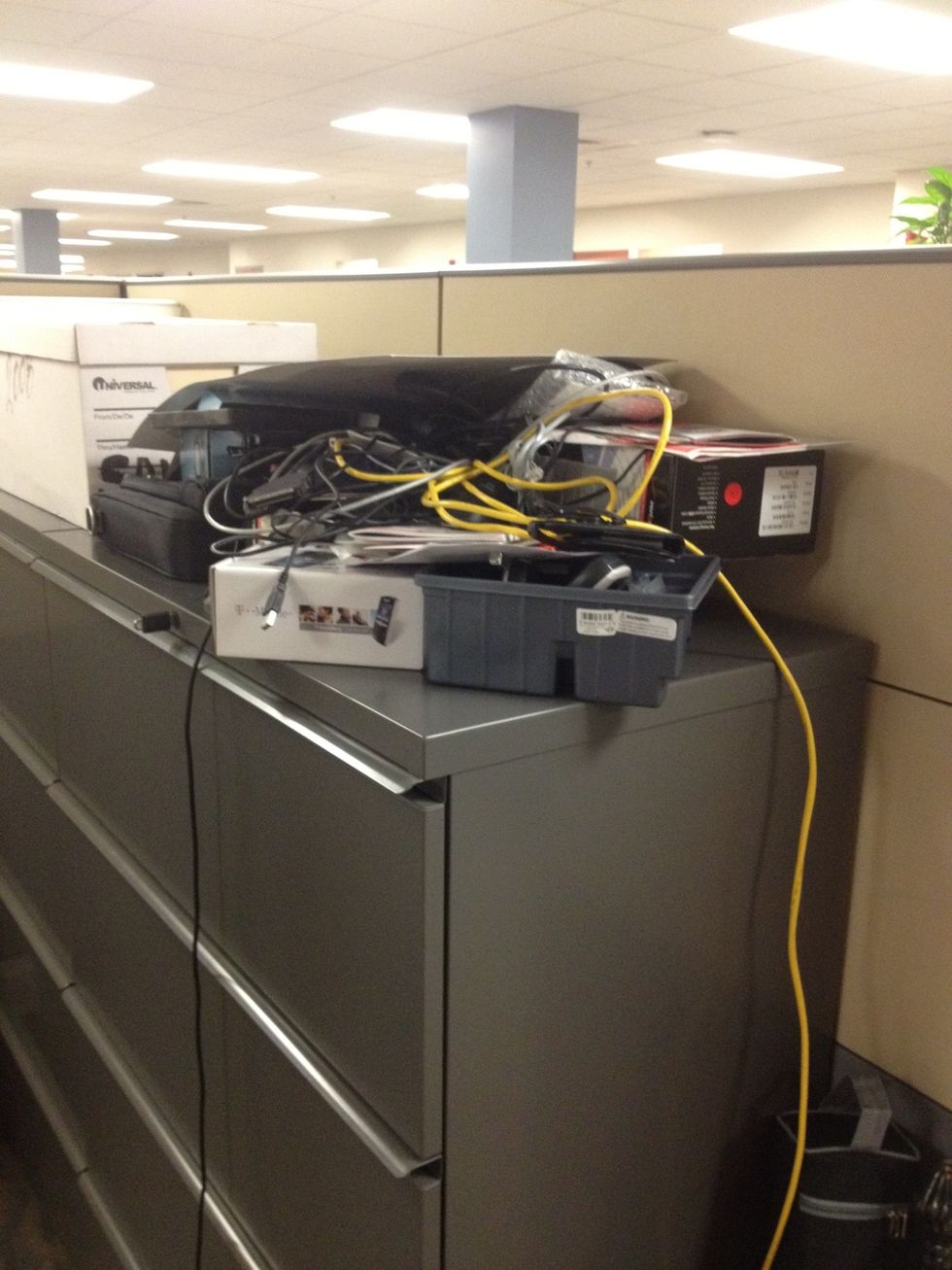 If you haven't done so already, leave a stack of messy items with wires hanging out of them on shared file cabinets