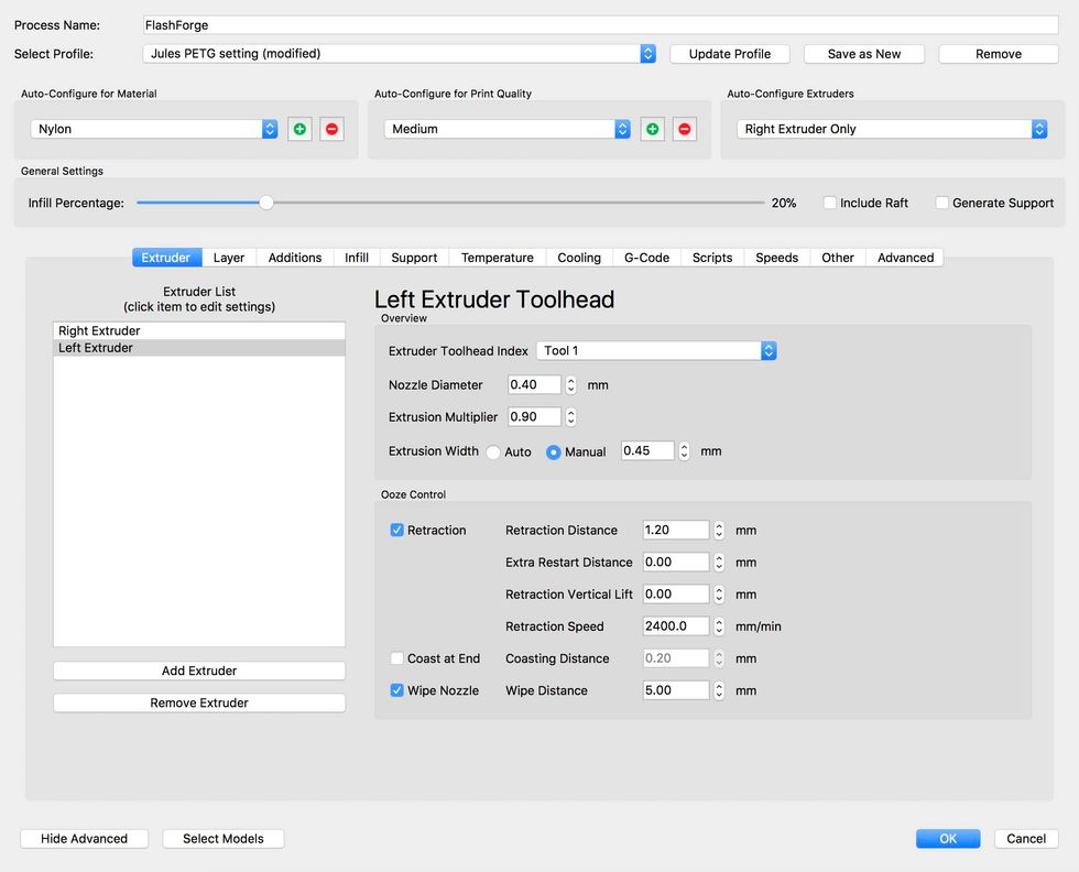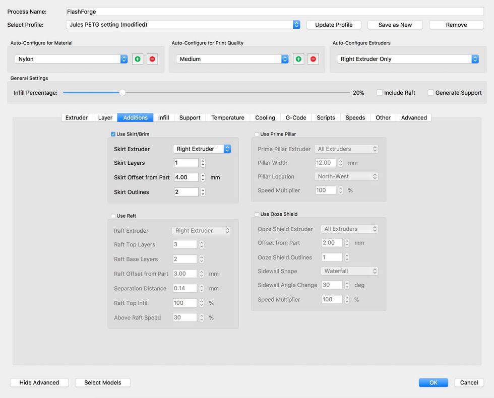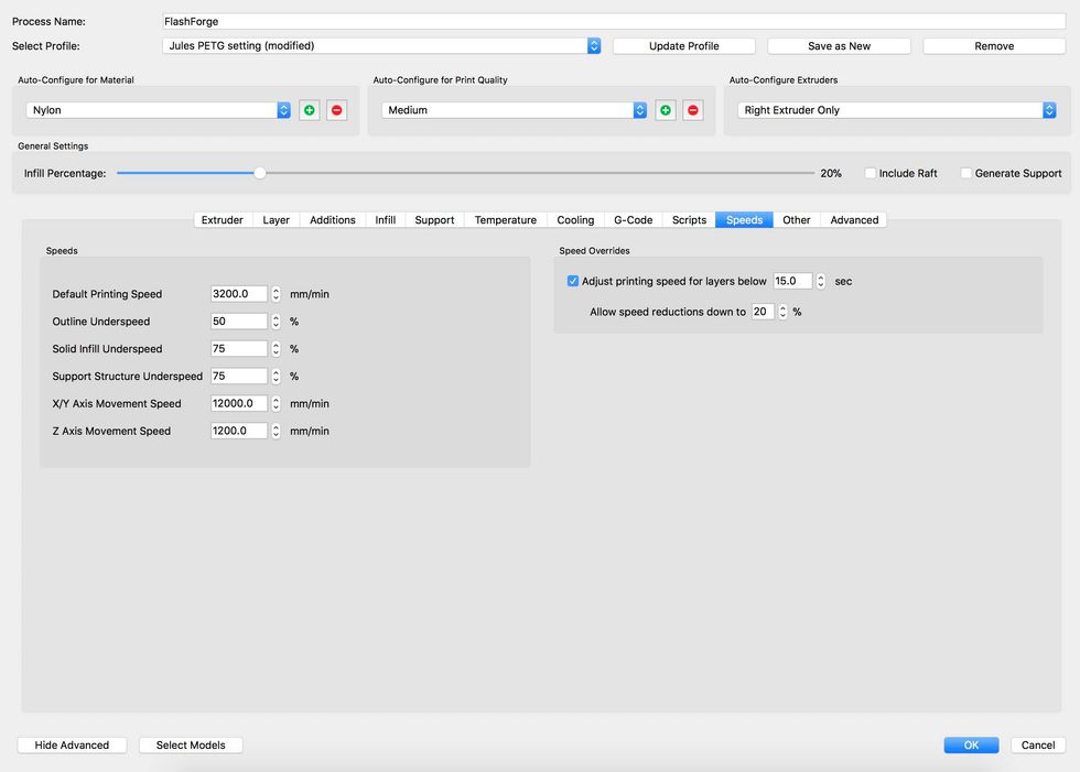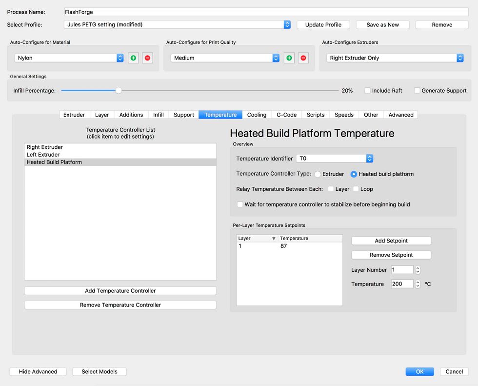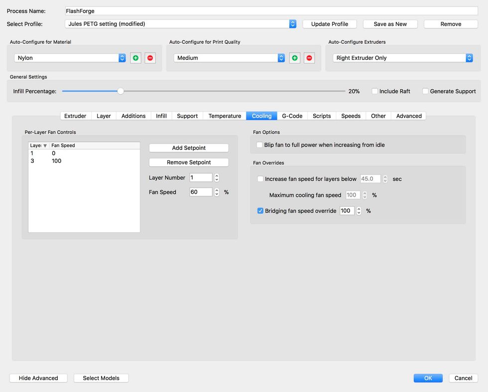 Jules recommends using .25 for layer height but I have found 2.0 works just fine.
