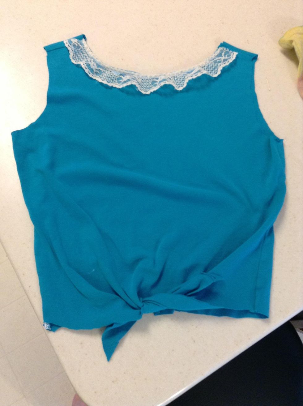 measure out amount of lace neededcut to desired lengthget fabric glue.apply glue to thick part of lacelay down on the neckline of shirt or tank top and let dry for 20-30 minutesthis is the completed look (:
