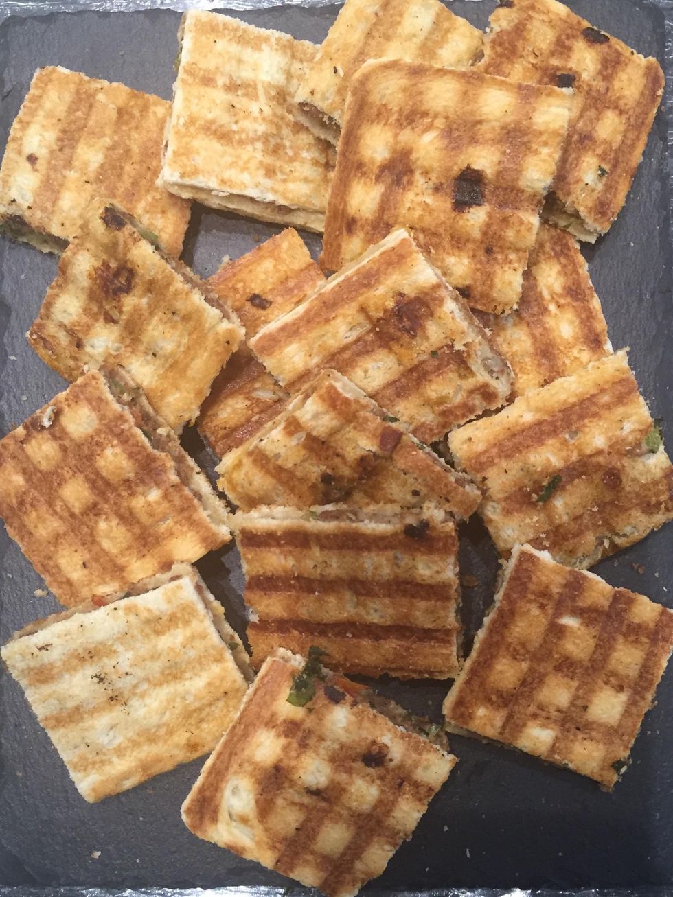 It is a simple recipe. Prepare the meat mix. Put a thin layer between 2 layers of bread Grill or bake. 5 mins. Done. Cut and serve. At the meal time. It is 5-8 mins; the time to grill.
