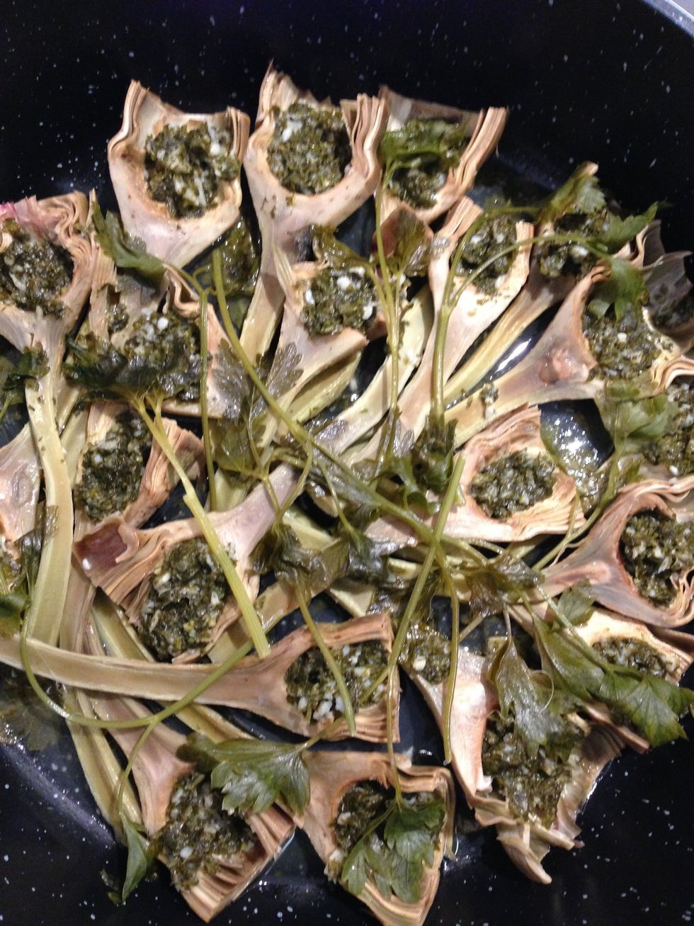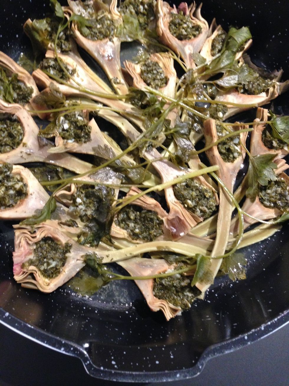 In each half artichoke, put a teaspoon of the mixture. If some remains just add them in the pot. Add 2TBsp water 1-2 TBsp olive oil. Cover. Bring to a boil. Cook on low for 1 hr or until tender