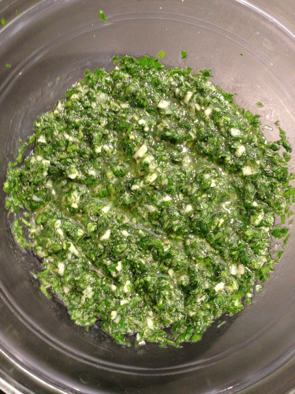 Squeeze 1 lemon add olive oil peel and crush the garlic add to the lemon-oil. Mince the parsley and the mint.