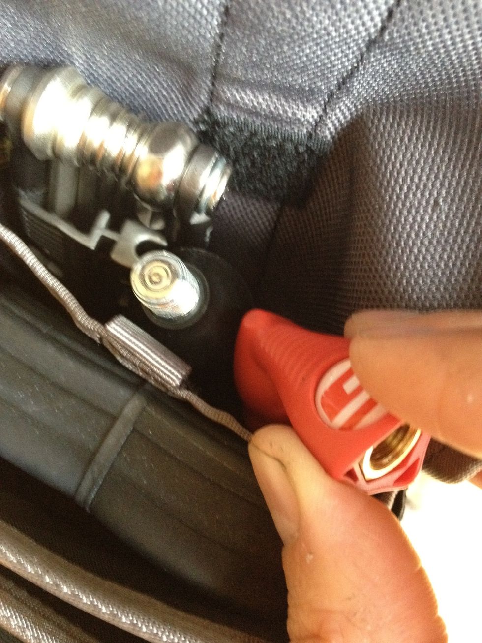 Pack in the inflator - make sure to leave the nozzle disconnected until you need to use it.