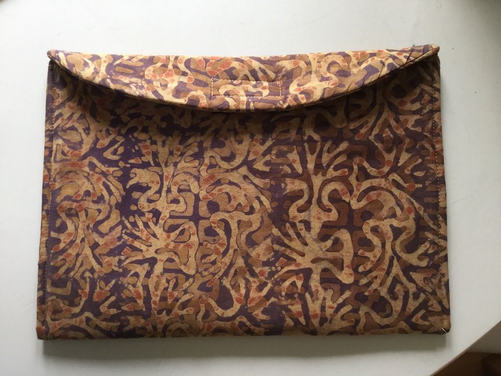 Vänd nu fodralet ut och in så att rätsidan kommer utåt. Nu ska den öppna kortsidan sys igen. Vik in tygerna från båda sidor , cirka 1cm och nåla ihop . Sy med raksöm. Fäst tråden.