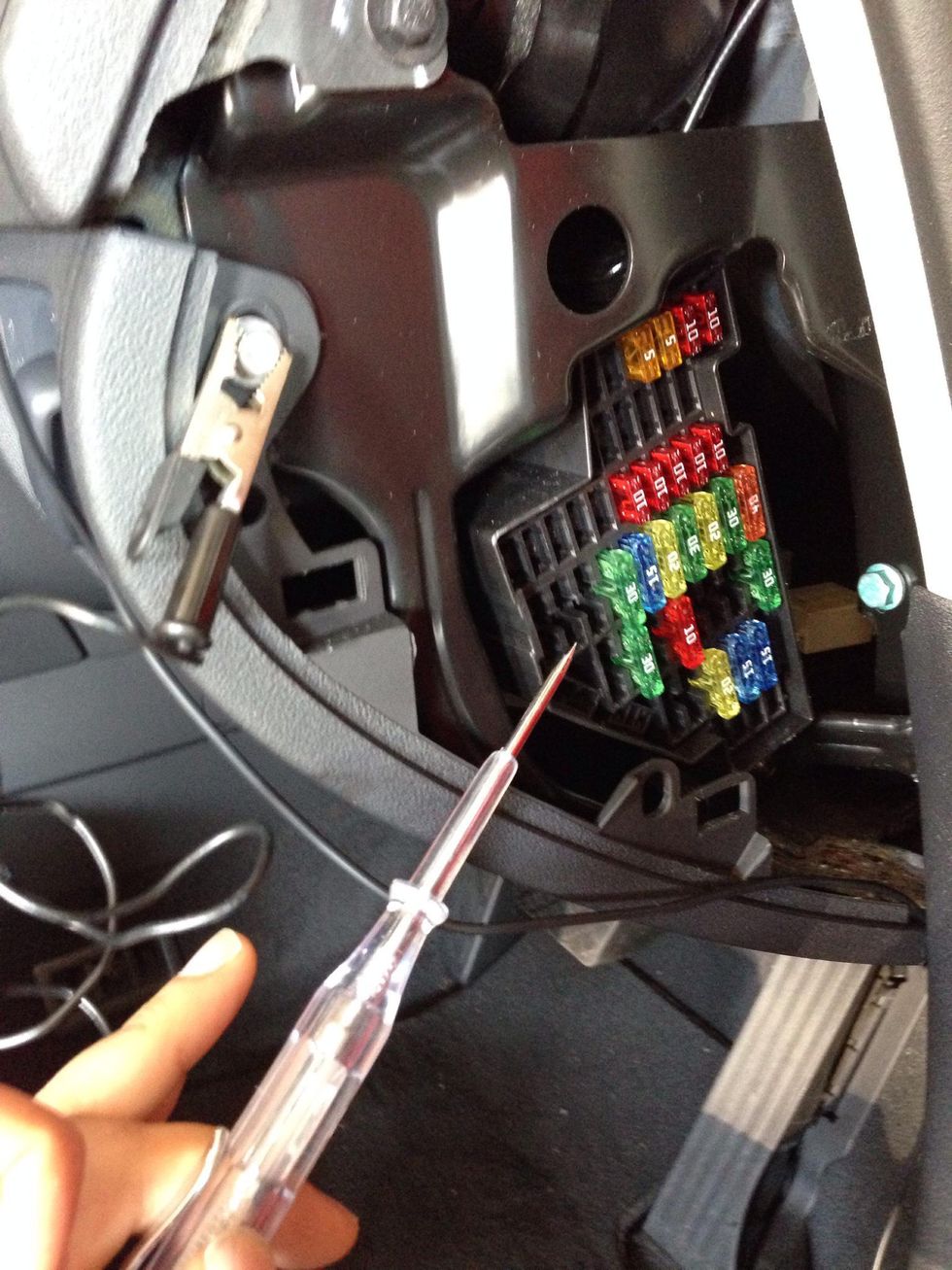 検電テスターのグリップを左のボルトに付け、その後、各ヒューズをチエックして、電流が流れているものを探します。 その際、エンジンをかけている時とかけていない時で測定します。