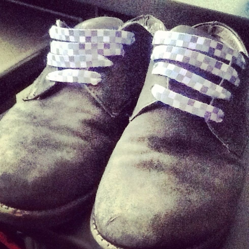 Next: put the shoelace in the bottom right whole, but remember put in from the outside