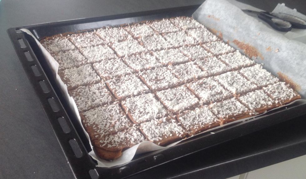 När kakan svalnat brer du på glasyren och häller sedan på rikligt med kokos. When the cookies have been cooled spread the icing and pour on much with shredded coconut.