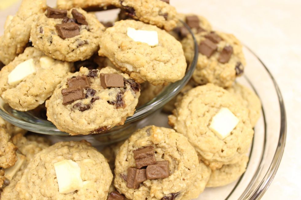 Using 1 basic oatmeal cookie dough, bake chocolate chip walnut raisin oatmeal cookies and white chocolate chip macadamia cookies at the same time. Yields: 6.5 dozen cookies.