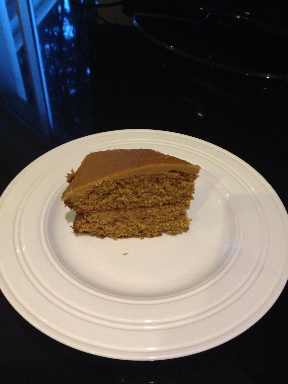 Once cool ice the bottom on one of the layers and the top of another. Place the one iced on top above the other (which should be flipped). And now your cake is complete. Enjoy.