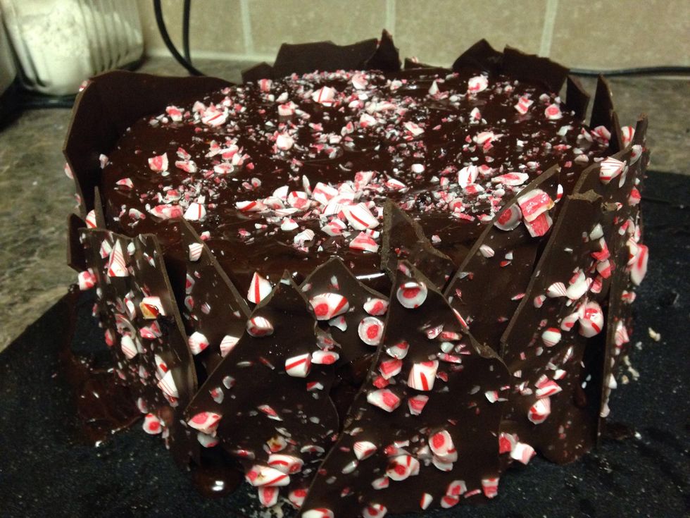 Break your peppermint bark into shards. Stick to sides of cake. You can use extra ganache as glue.