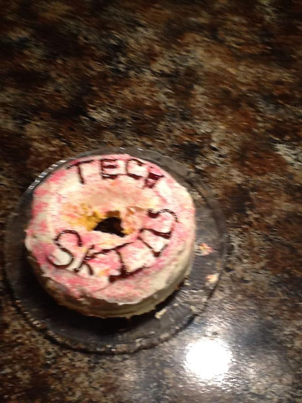Gather suppliesPut ingredients in a bowl and mixPour batter into moldPut lid on one moldGet ingredients for filling and mixTake cake out of the ovenPut on fillingDecorateAll done