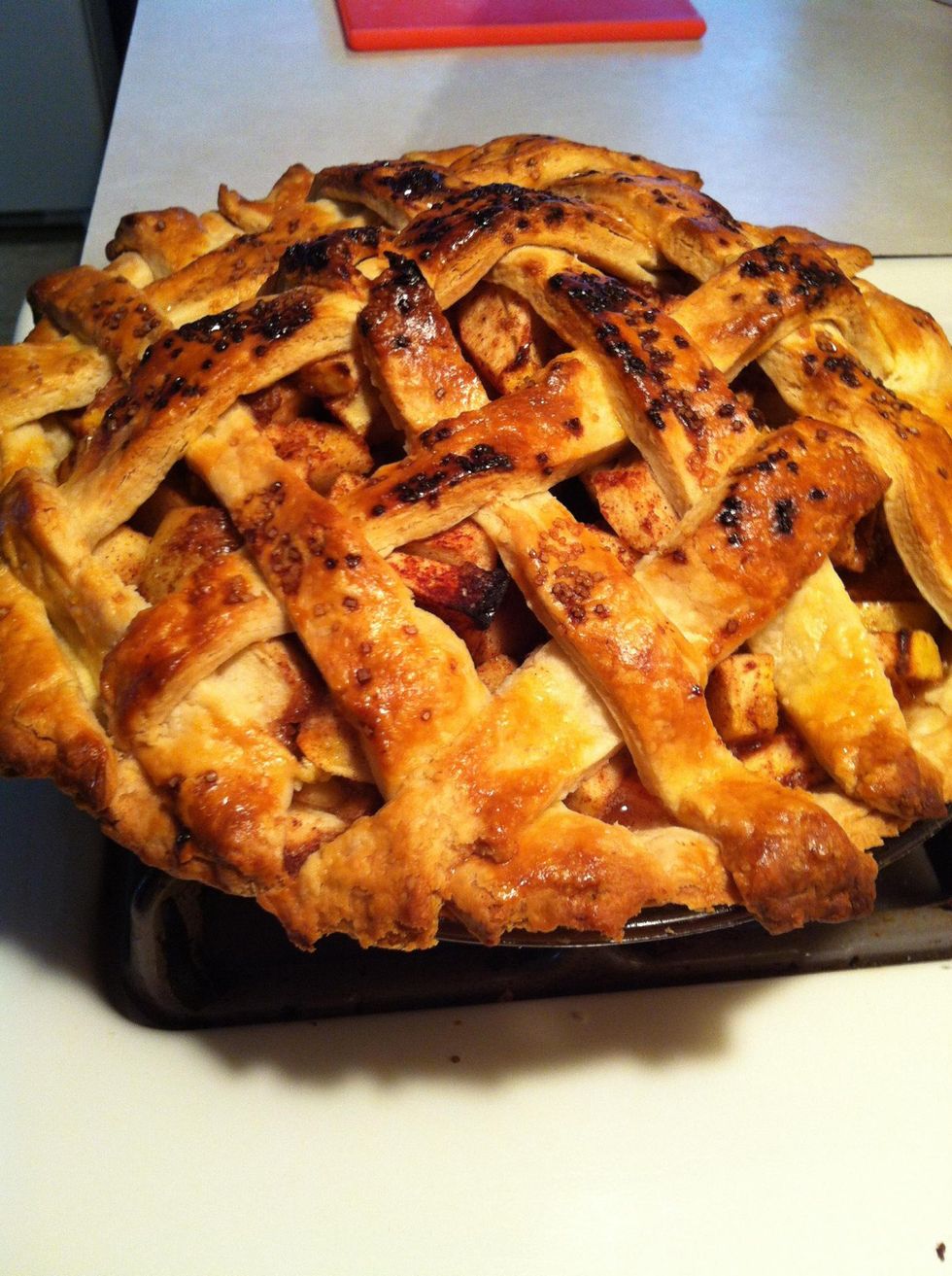 Lay one sheet in pie pan, add apple mixture then get fancy with laying top crust. Add an egg wash and raw sugar.