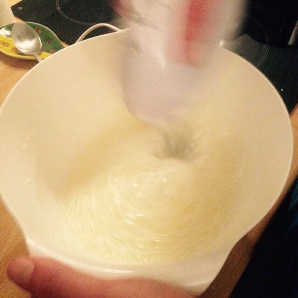 Take the other bowl with whisked sugar and yolks and pour in the now cold but still melted chocolate and butter. Whisk together