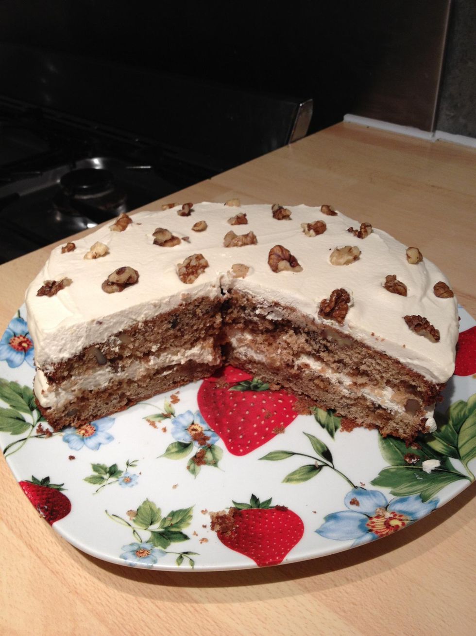 Spread the whipped cream in between the layers and on top of the cake. Decorate with walnut peaces.