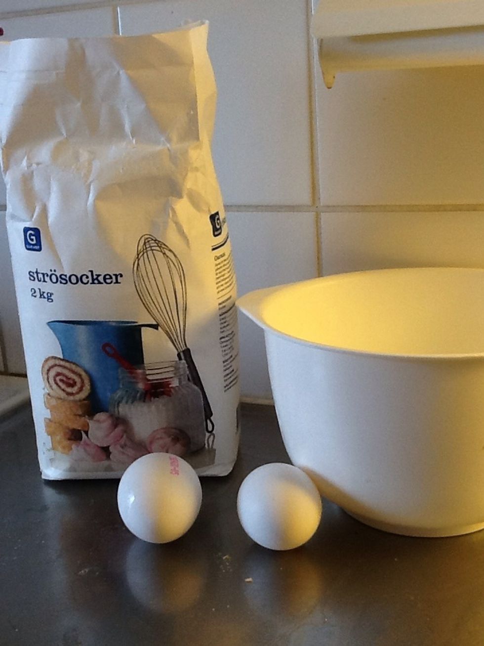 You will need 2 eggs and and 2 decilitres of sugar. And then you will whisk it together into a batter.