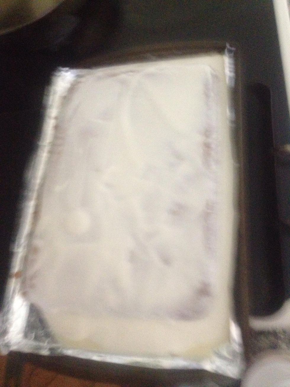 Soak cake: Pour the mixture over the cooled cake. (might loosen or flatten - that's okay)