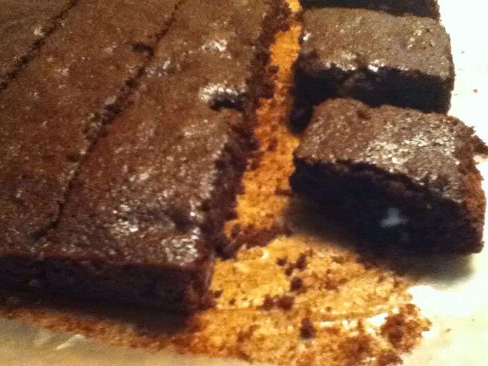Line a baking dish with parchment paper, then pour batter in and smooth the top. (This makes it way easier to get the brownies out of the pan). I also sprinkled sea salt over the top of the batter.
