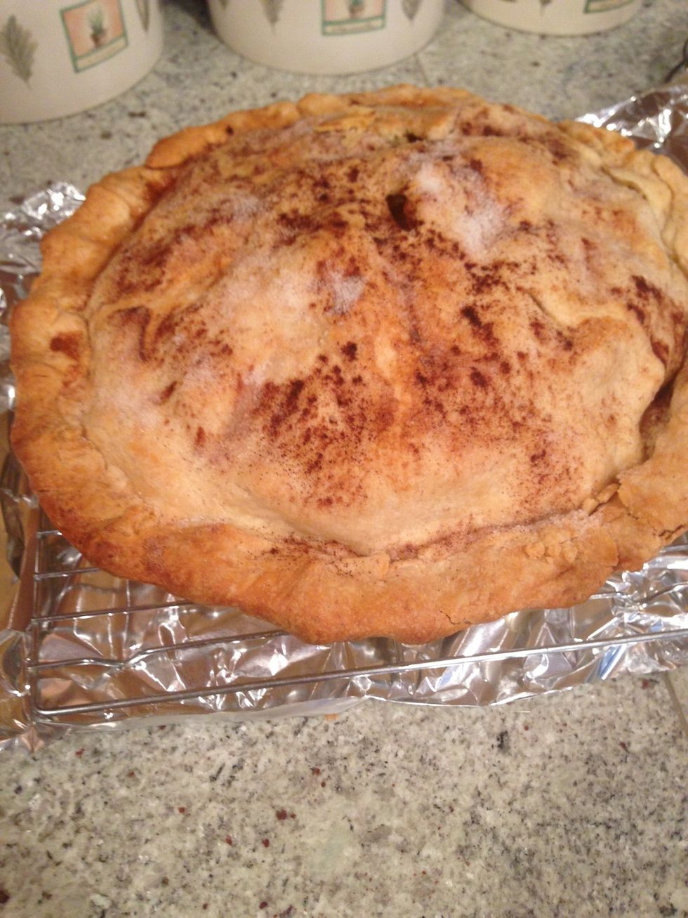 Roll out top crust and place on top of pie, pinch around edges, and poke a few holes in the top of the pie.