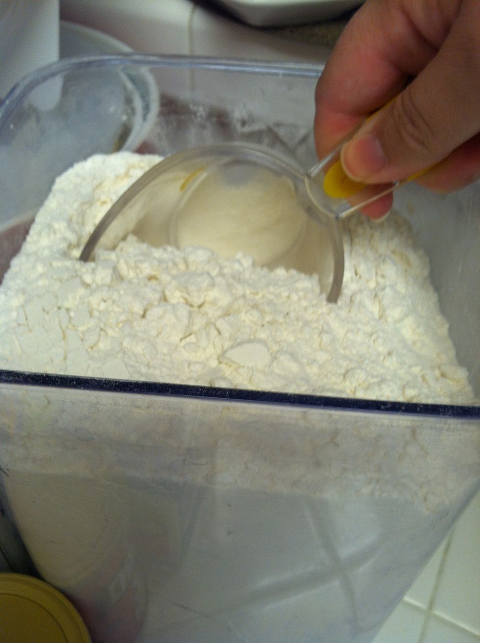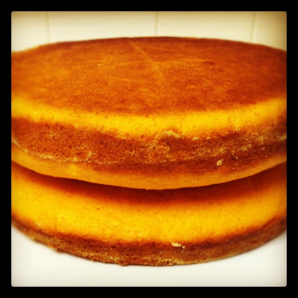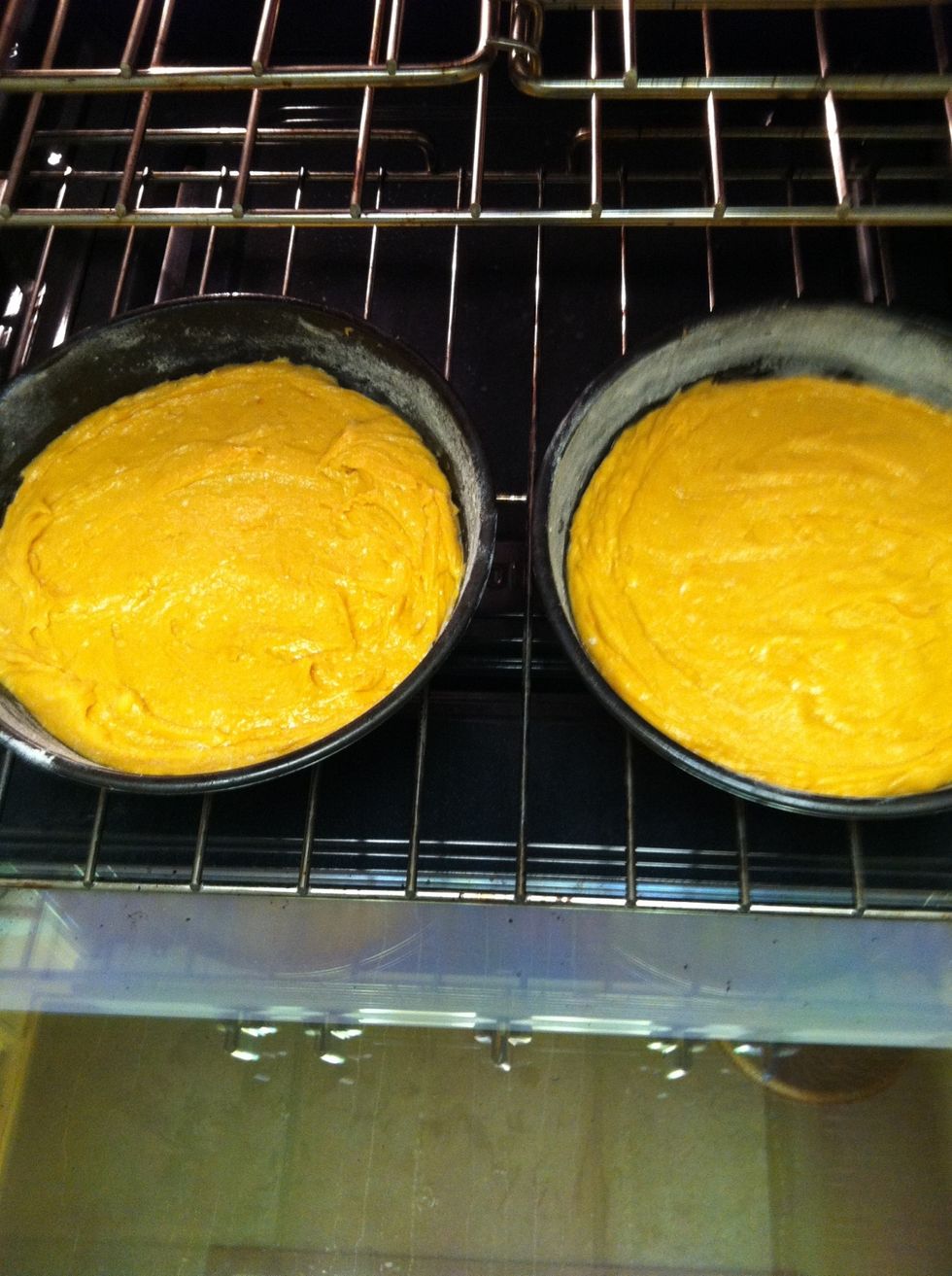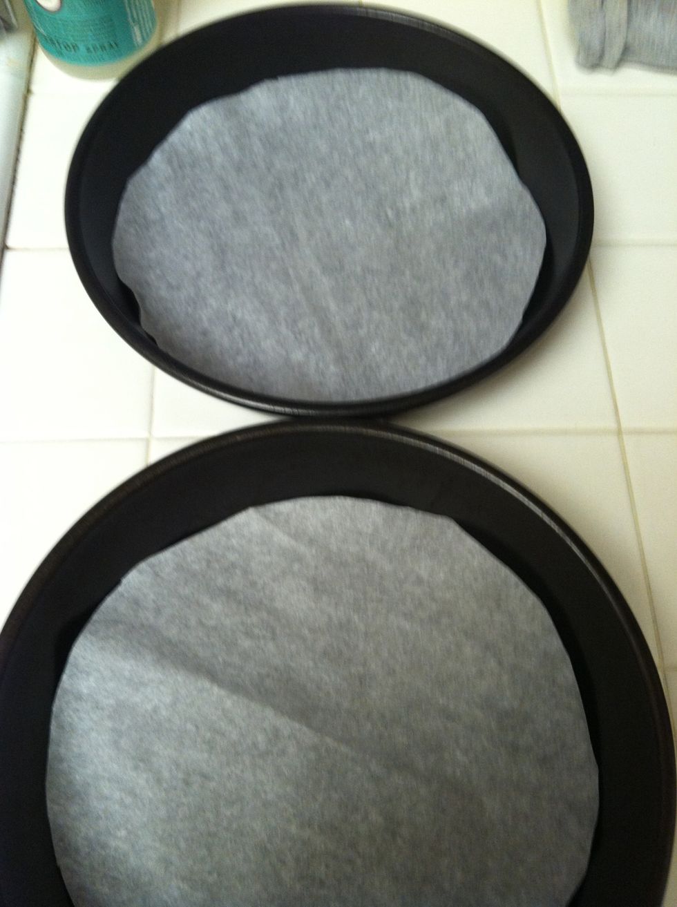 Butter and flour.. Probably spray for good measure two 9 inch cake pans. Split batter between two pans.