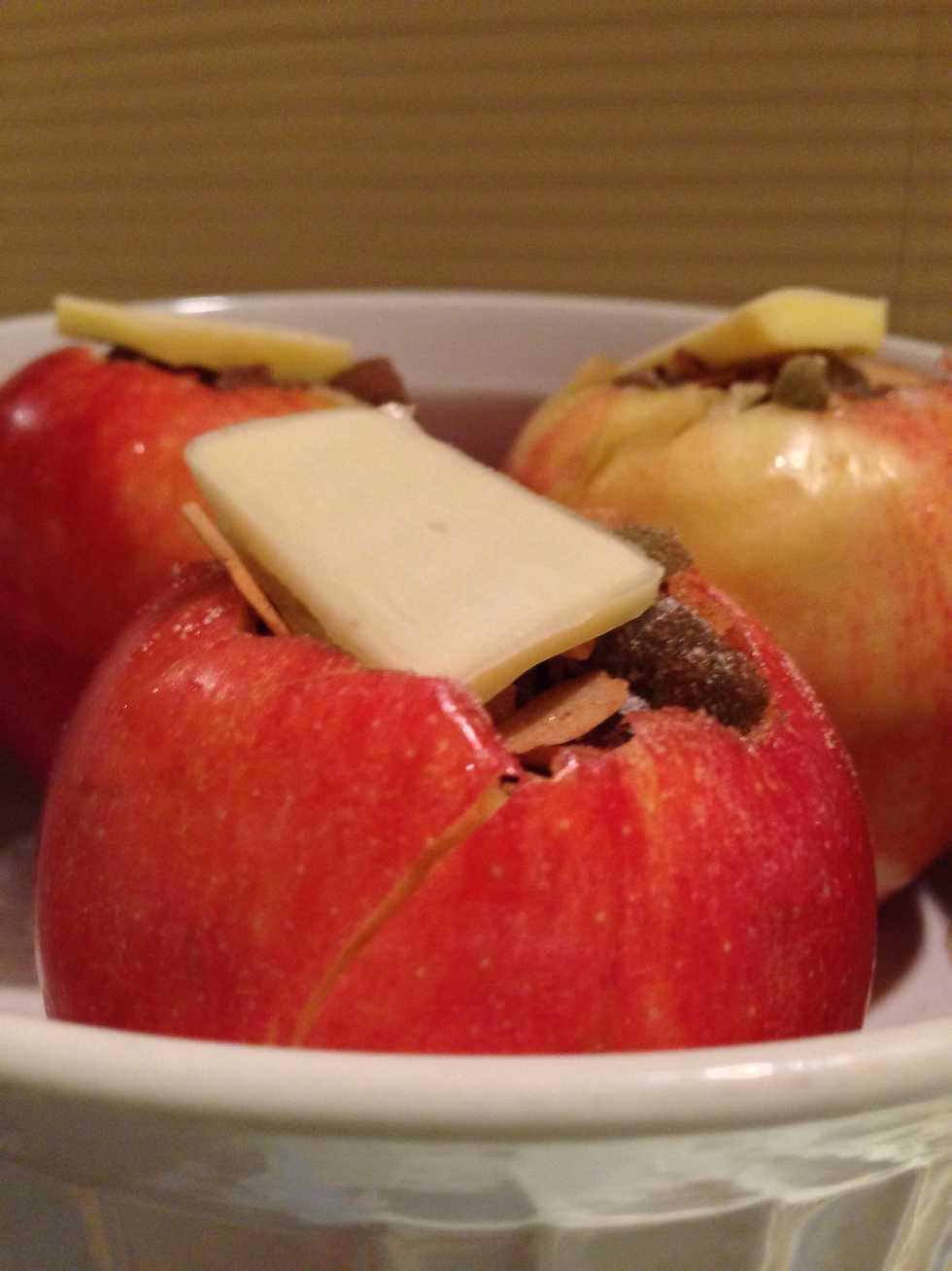 I stuffed the apples with the dry mixture and added a thin slice of butter atop. Then I poured 3/4 cup of boiling water into the baking pan before putting the apples in the oven for 30 minutes.