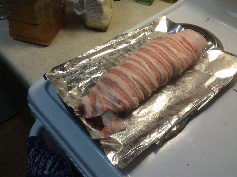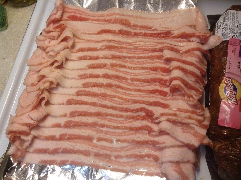 Lay the bacon out flat on sheet pan, on top of the foil, 1 on top of the other by a 1/4 of the slice