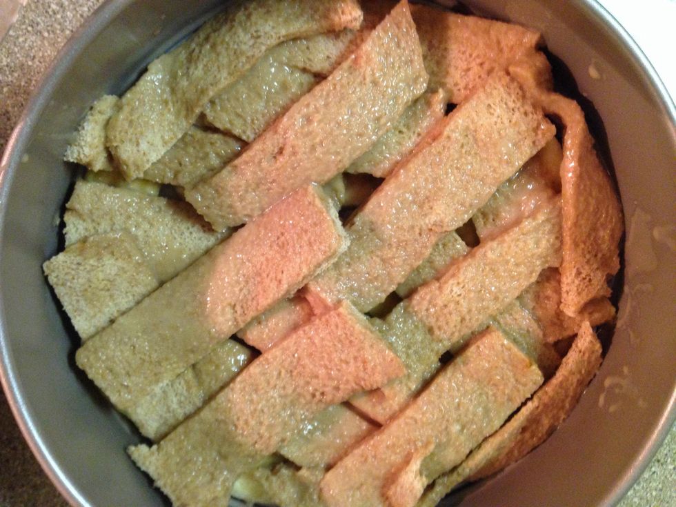 (1) Layer 1/2 the bananas on round cake pan with parchment payment on the bottom (Snap it close.) and glaze the sides with butter.
