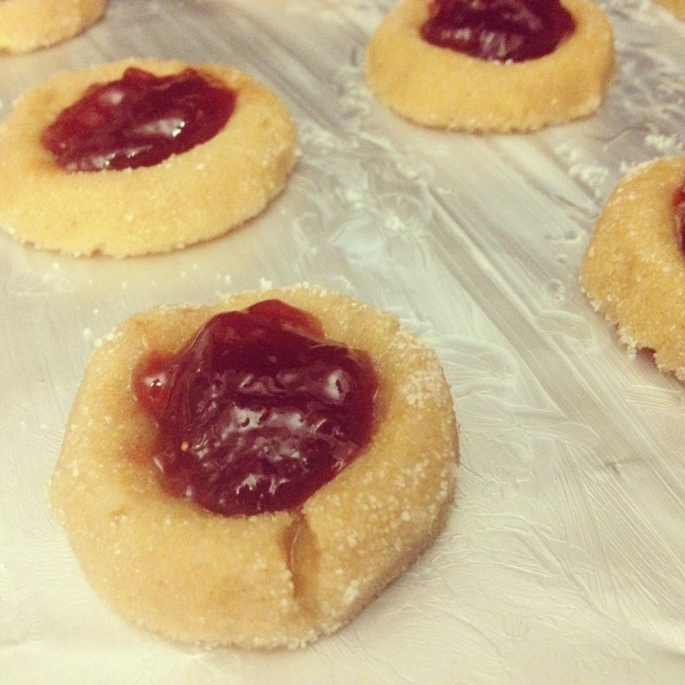 Remove from oven when cookies are a warm blonde color and jelly is bubbly.