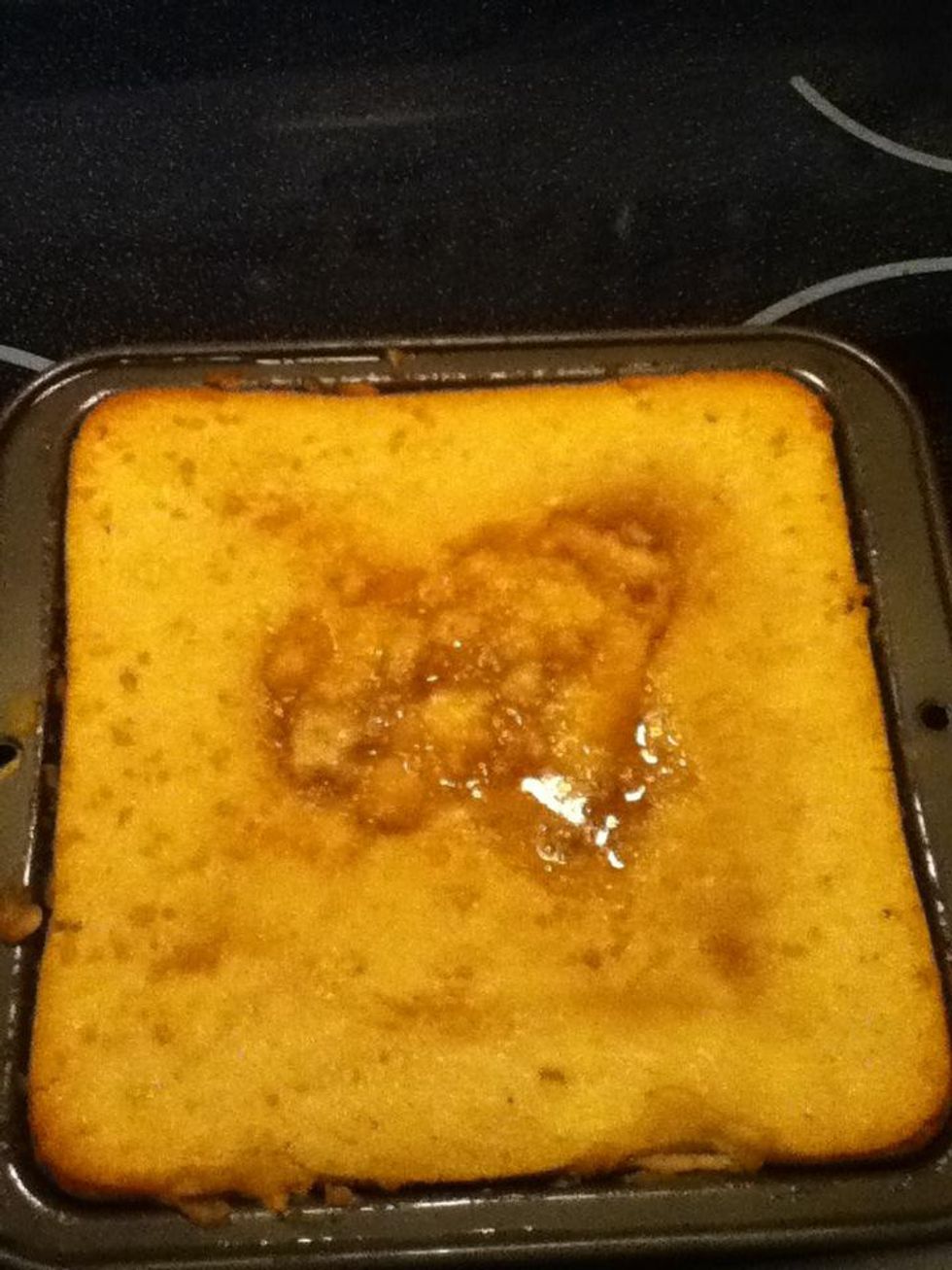 Note: let the cake sit for awhile because the caramel thickens when it cools.