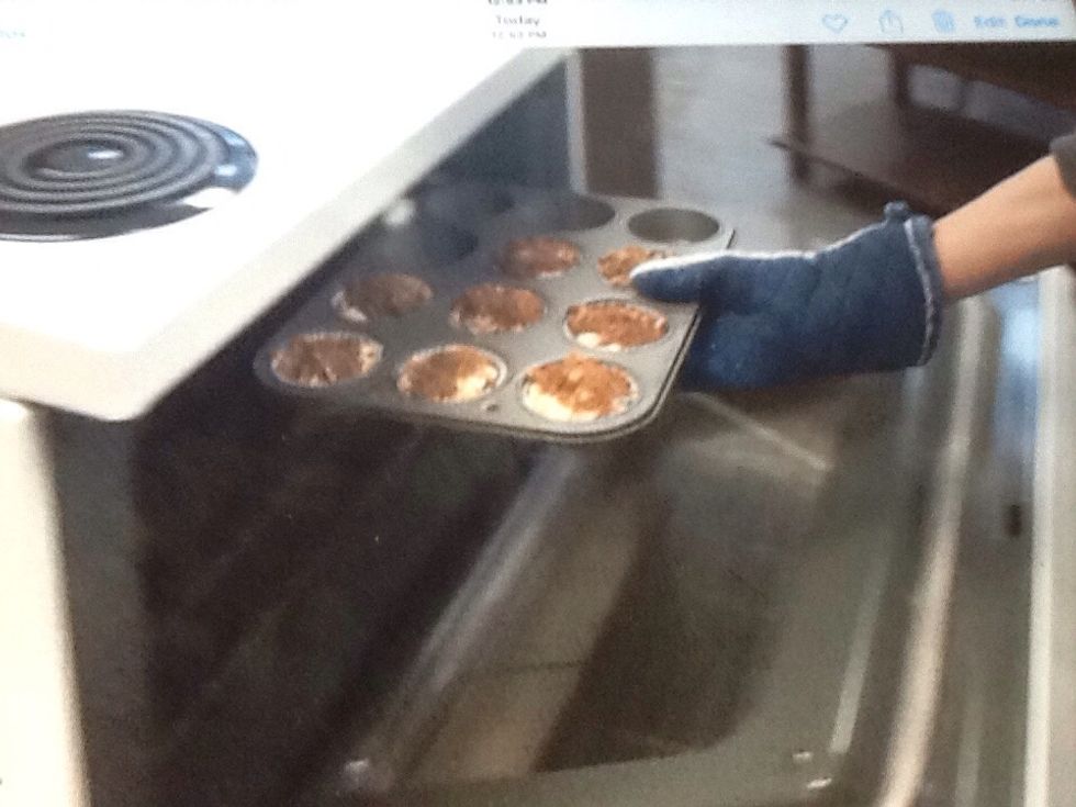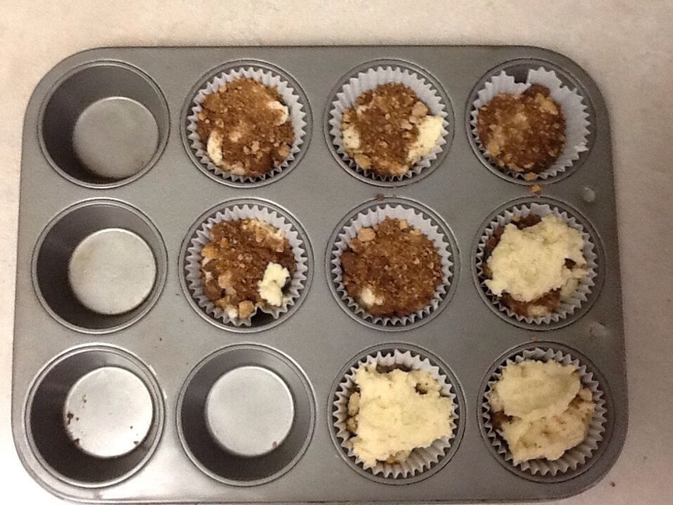 Alternate layers of battery and spicy topping to make eight muffins.