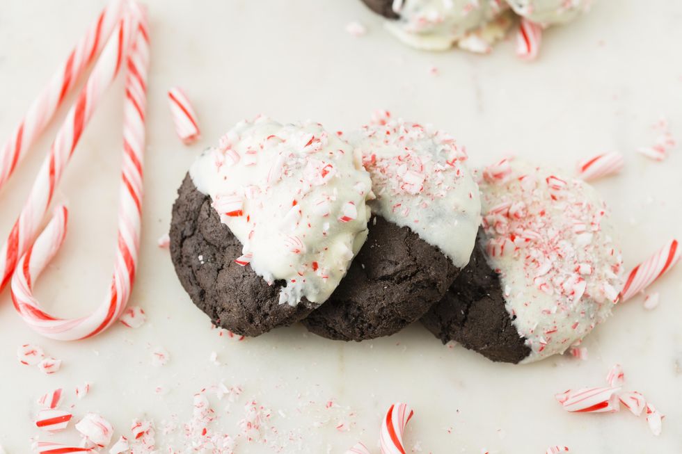 Dip cookies into melted white chocolate then place on a parchment lined baking sheet. Finally sprinkle with crushed candy canes.