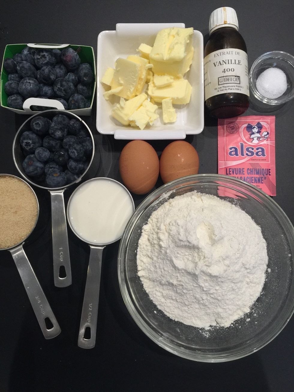 Dry ingredients: flour 270g-2cups. sugar 150g-3/4cup. Baking powder 2tsp. Sodium bicarbonate 1/2 tsp. Salt 1 tsp