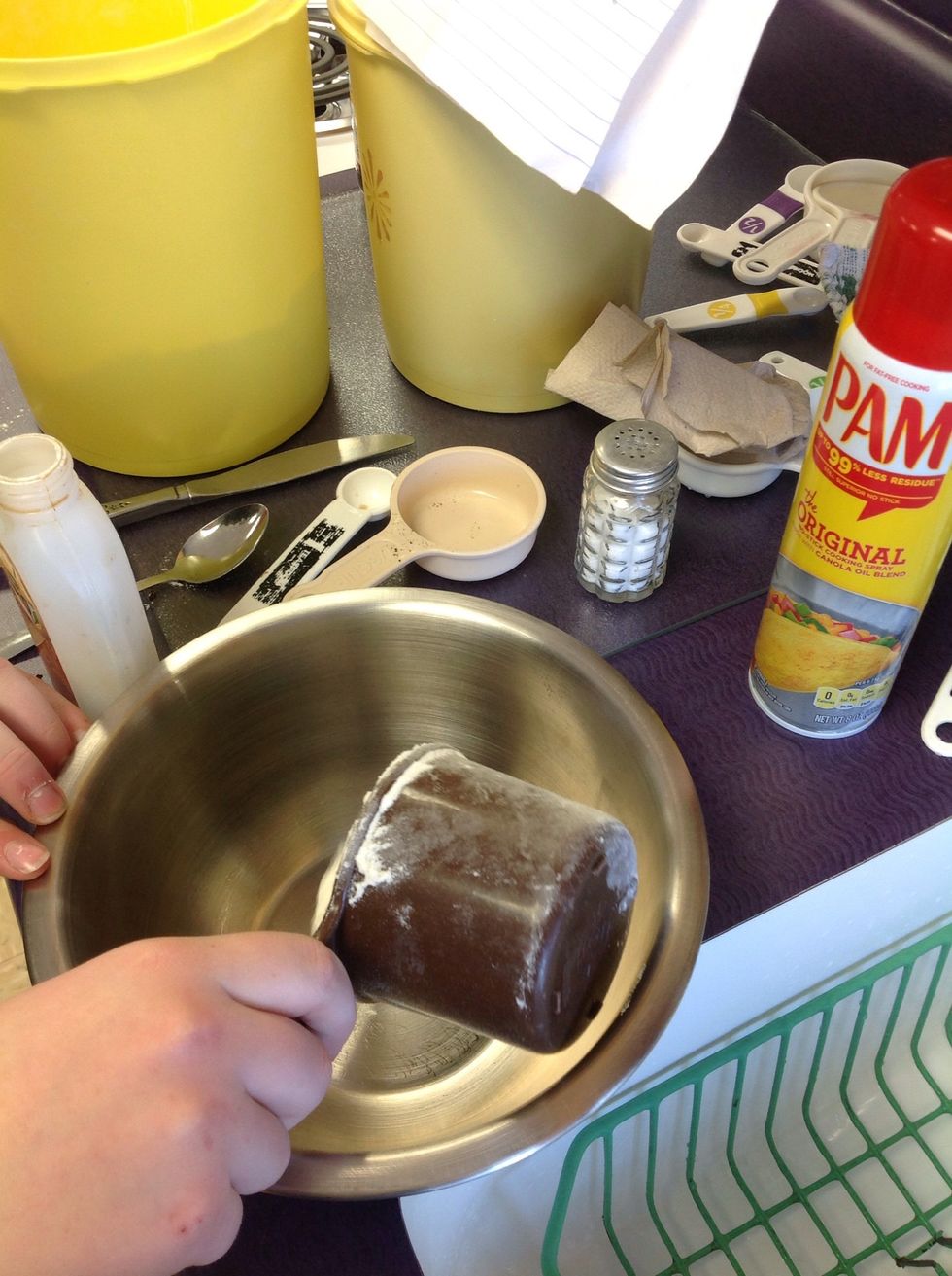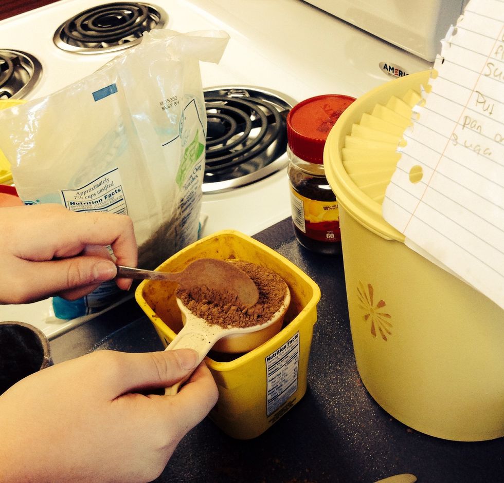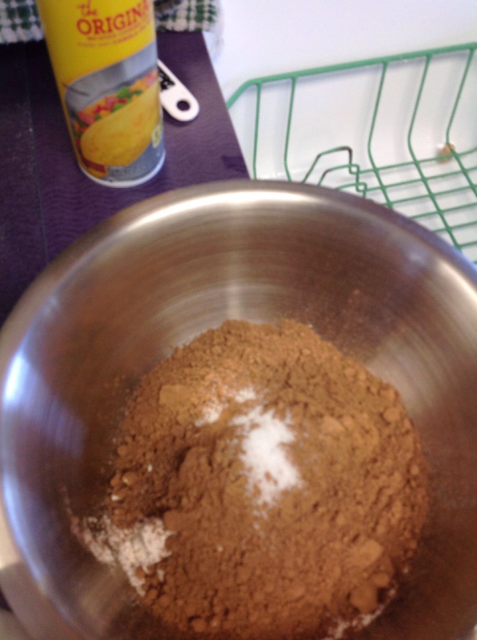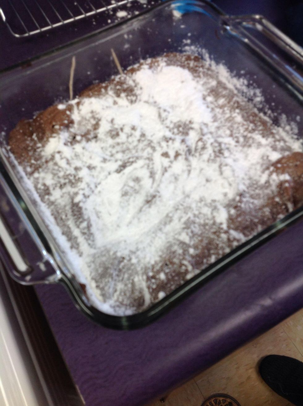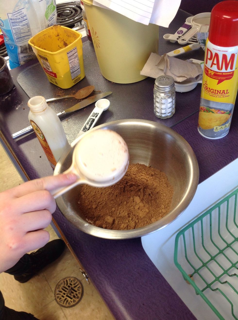 1cup sugar 2 eggs 1T hot water 2t instant coffee granuals 1/4 cup melted butter 1t vanilla 1 cup flour 2/3 unsweetened cocoa 1/4t salt Cooking spray Powdered sugar