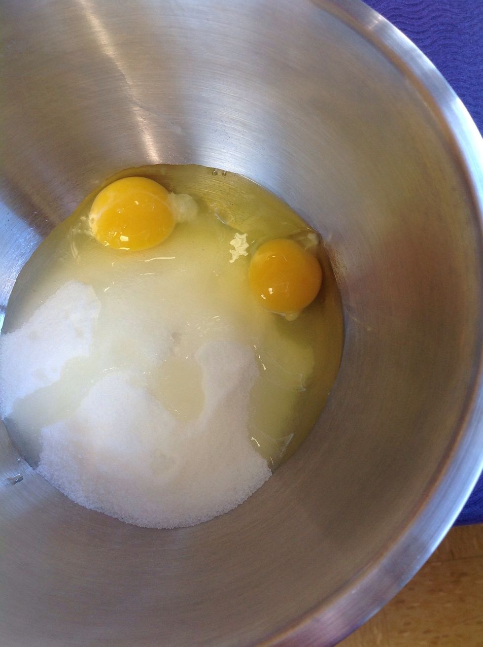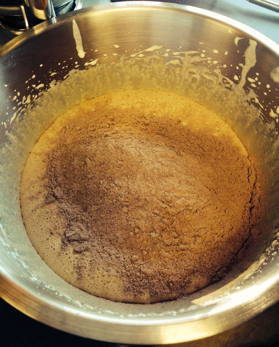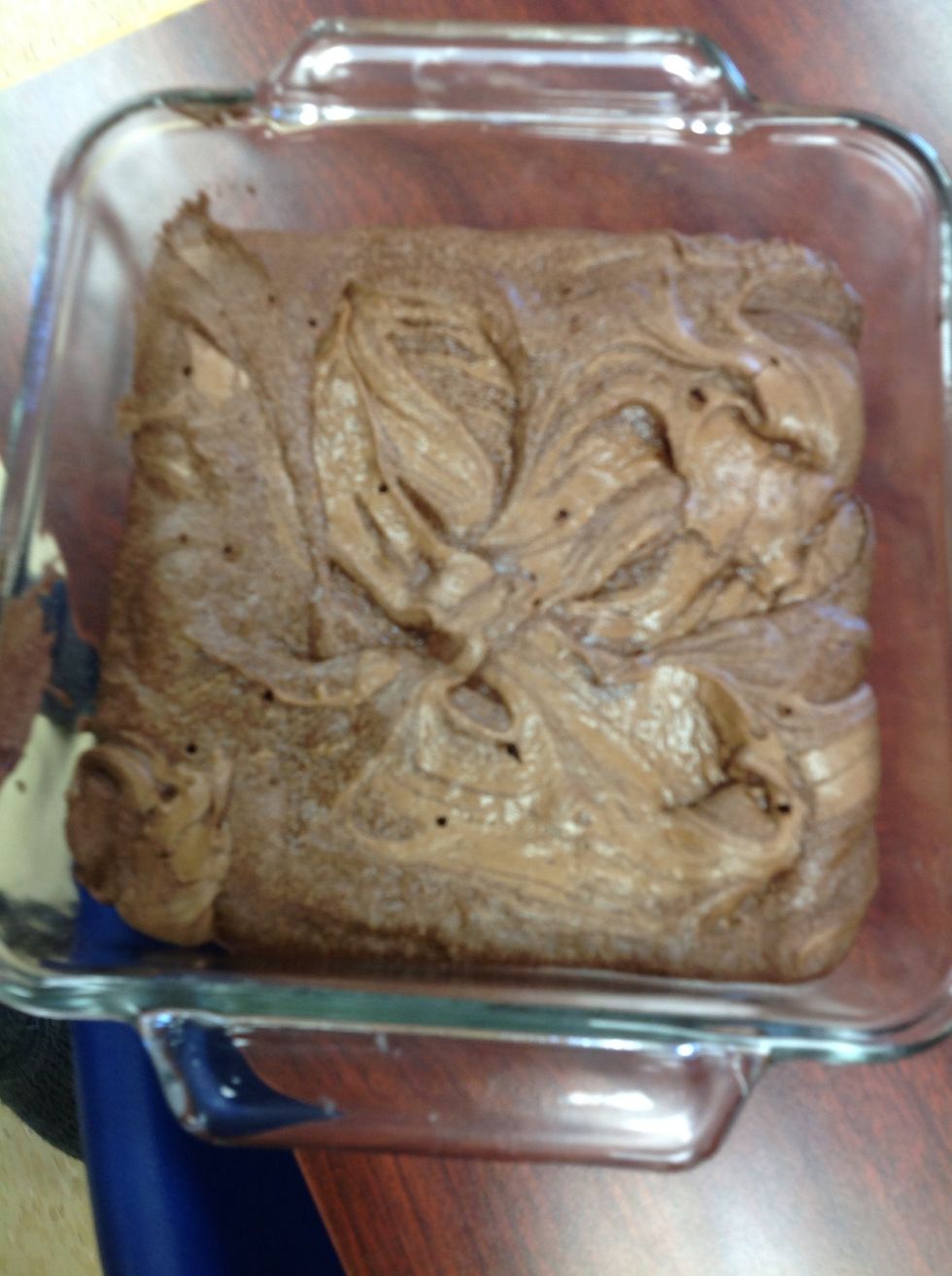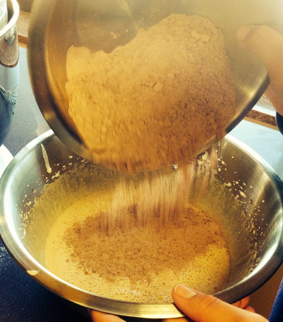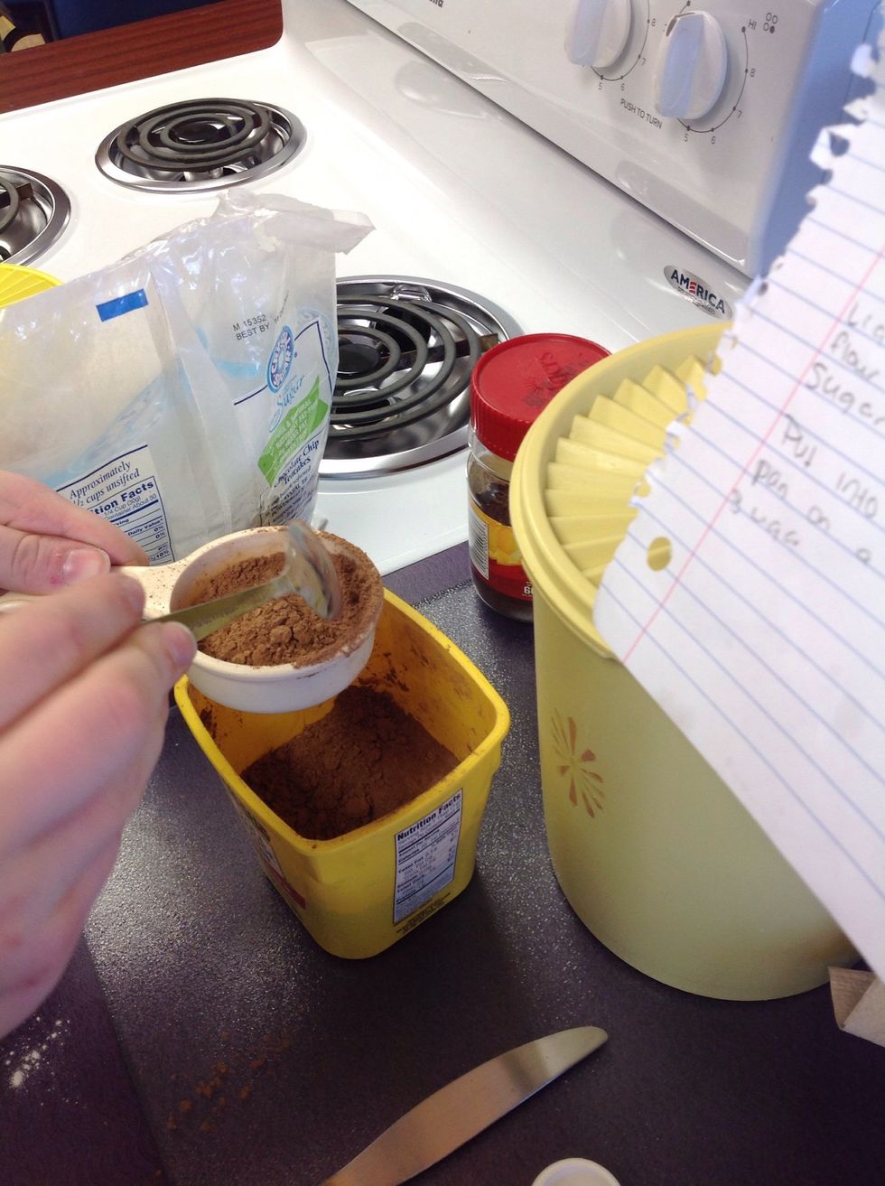 1cup sugar 2 eggs 1T hot water 2t instant coffee granuals 1/4 cup melted butter 1t vanilla 1 cup flour 2/3 unsweetened cocoa 1/4t salt Cooking spray Powdered sugar