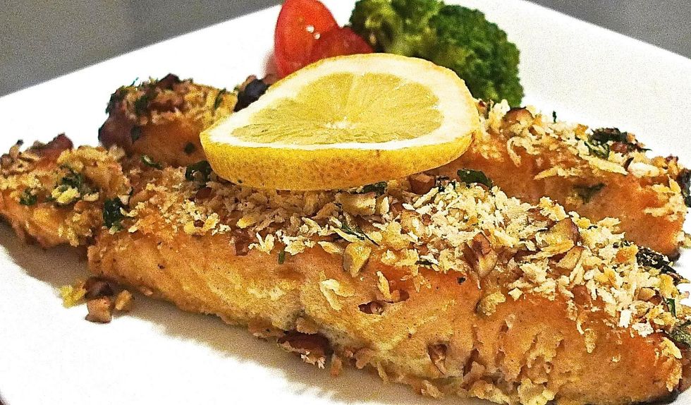 Prepare breadcrumbs, chopped pecans and fresh parsely to sprinkle on top of salmon.