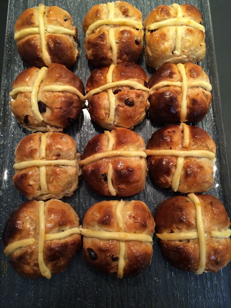 2 hrs after the buns are tripled in size....time to put the crosses. Snip delicately the surface of each bun with the scissors without disturbing the dough. And place the ropes of dough in a cross