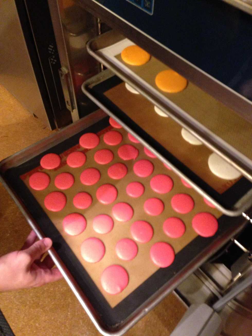 Rest the macarons for about 20 min. They should not feel sticky on top before going into the oven. Be sure to give them enough spacing, unlike we did with ours on the bottom left.