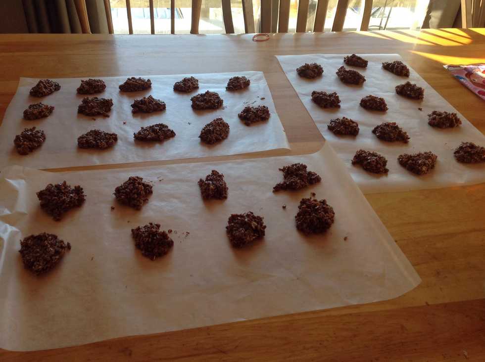 Here I am all done! You want to let them harden in the fridge for aprox. 1 hour or until hard enough they don't fall apart. Kids love them. As kids they were cow plop cookie. Enjoy and follow!